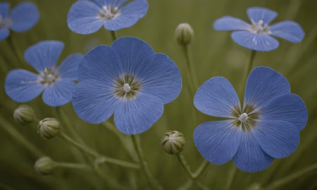 Detailed close-up of blue flax flowers with slender stems and unopened green buds, set against soft, dreamy green and blue hues of a tranquil outdoor setting.