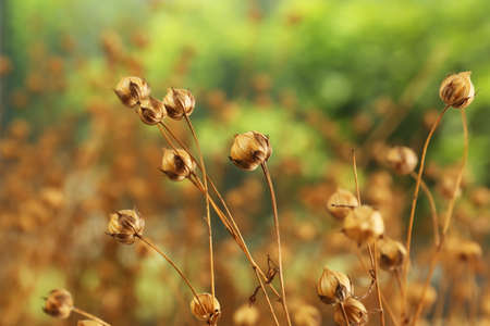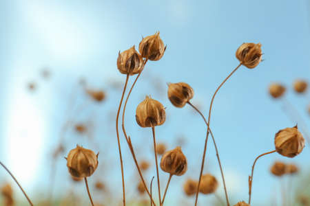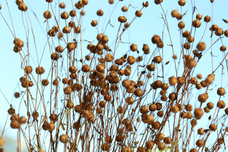 closeup ripe dry seed capsules of common flax or linum usitatissimum stock photo.