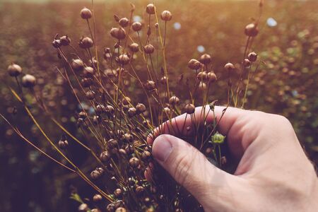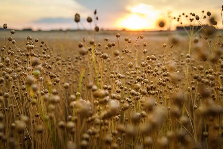 Detail on flax plants (Linum usitatissimum) on field during sunset in Austria. Shallow depth of field.