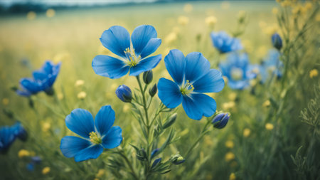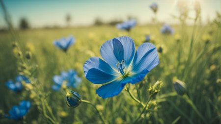 showing close-up of vibrant blue flax flowers blooming in a sun-drenched field with a bright sunburst and...