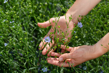 Wild cute tiny blue flowers bloom on spring summer field, flax plant on home farm, natural herbal cultivation for linen, oil or linseed