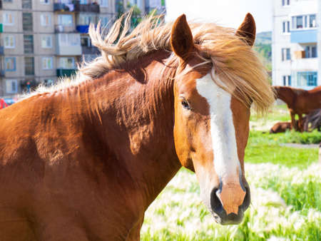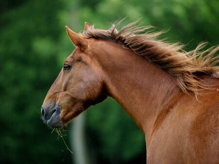 Portrait in the sun rays of a brown chestnut horse with a white stripe on the muzzle and a mane fluttering in the wind