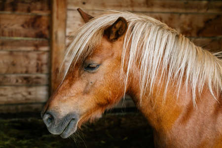 brown shetland breed pony horse in the ranch standing up with closeup photo in the stable