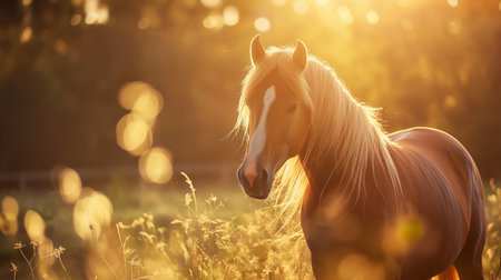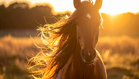 A magnificent horse stands in a tranquil field as the setting sun casts a warm, golden glow. Its mane, caught by a gentle breeze and backlit by the sun, creates a breathtaking silhouette, evoking feelings of freedom, natural beauty, and untamed spirit.