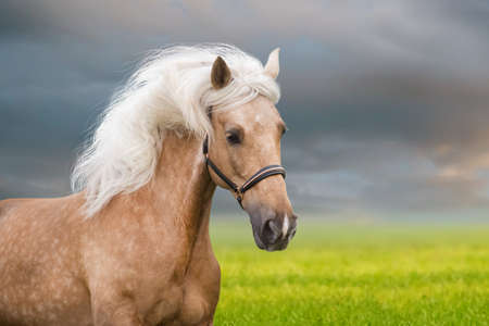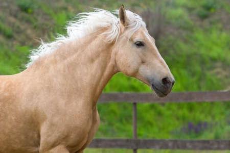Palomino horse with long mane portrait in motion
