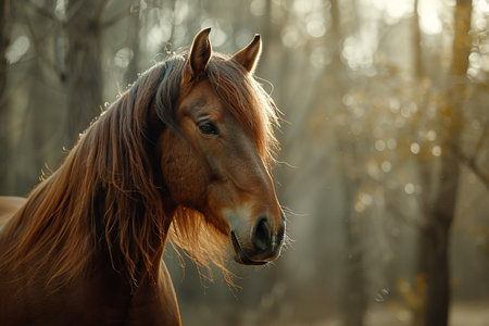 A stunning horse displays its flowing mane in a peaceful forest setting, illuminated by the warm glow of the golden hour, evoking a sense of calm beauty.