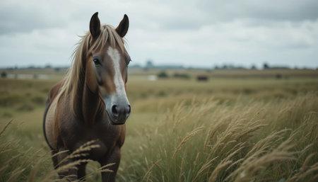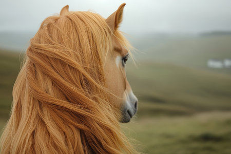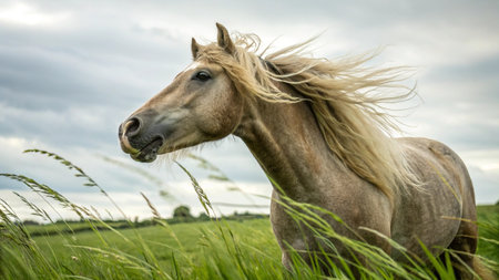 Palomino horse, windswept mane, rural landscape, calm day, equine photography