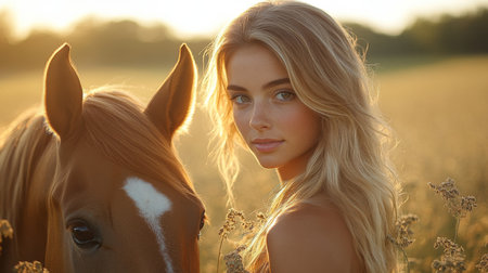 Young Woman With Long Hair Standing Beside a Horse in a Golden Field During Sunset, Capturing a Moment of Connection and Tranquility in Nature. Generative AI