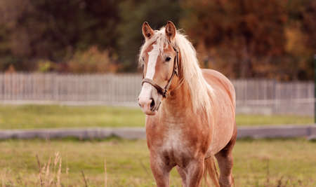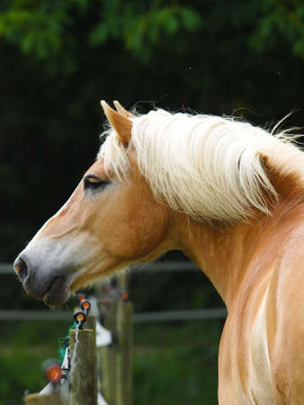 A head shot of a beautiful Haflinger horse with a blonde mane.