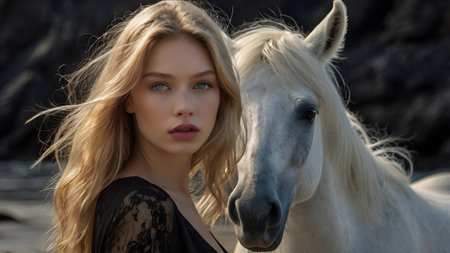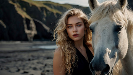Portrait of a beautiful woman on a beach with black sand against the background of the sea. Romantic, calm and sensual photo of a girl in a delicate dress and a horse.