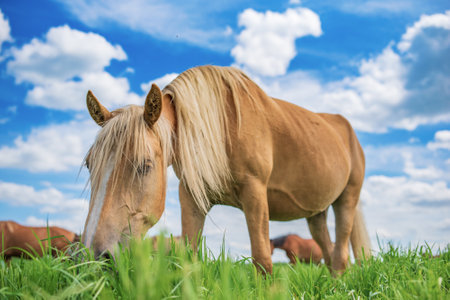 Two beautiful Palomino ponies are standing next to each other in a field on a bright summer day. livestock and agriculture. horse care.