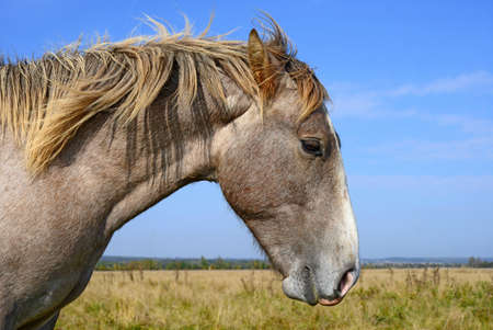 Horse in the meadow at sunset. Beautiful animal portrait.