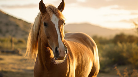 a brown horse stands on the desert floor, showcasing a western-style portrait with light orange and light gold tones. the photo, captured by clint cearley, features selective focus and sterling silver highlights. this creative commons attribution image captures the essence of the desert landscape and the majestic presence of the horse. ai generated