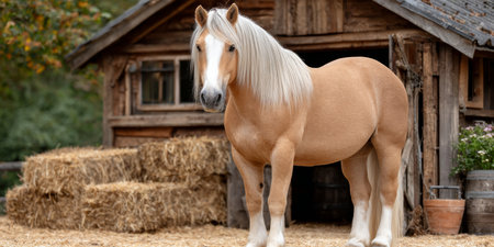Elegant Haflinger Horse Posing Gracefully Near a Rustic Barn in Tranquil Autumn Countryside Scene