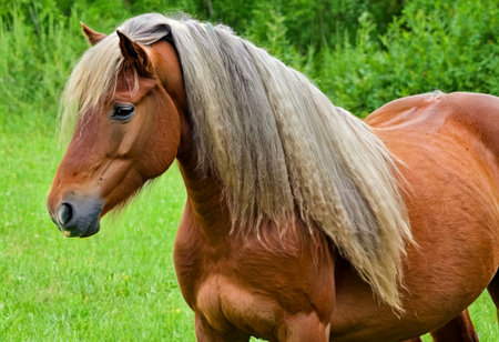 Horse in a meadow with long mane and long mane