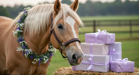 Palomino horse with floral wreath standing near lavender wrapped gifts on hay bale in green pasture during springtime.