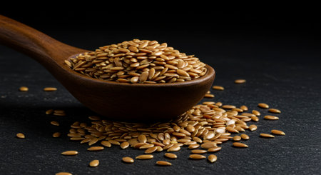 Golden flax seeds, also known as linseed, in a wooden spoon with scattered seeds on a dark stone surface. A healthy superfood ingredient for cooking and baking.