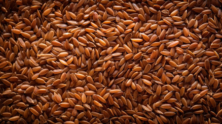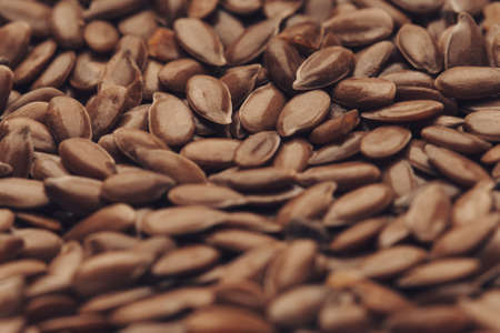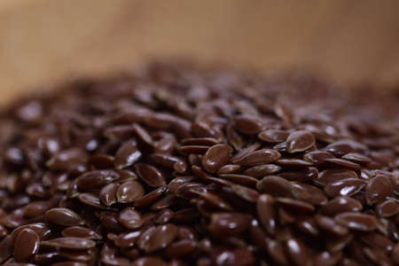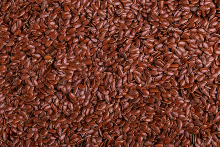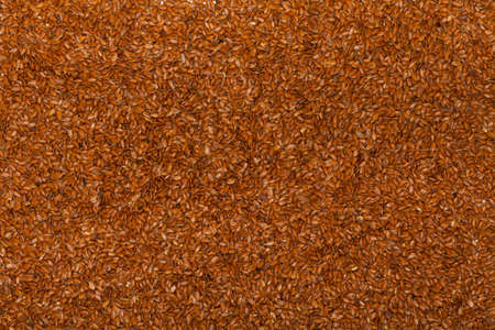 Close up of flaxseed linseed as brown red food background or grain texture. Diet and nutrition.