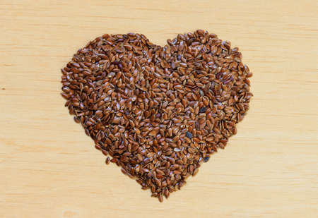 Diet healthcare concept. Raw flax seeds linseed heart shaped on wooden background. Healthy food for preventing heart diseases.