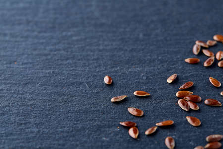 Close-up shallow depth of field picture of seperate healthy flax seeds on dark grey background, macro, top view.