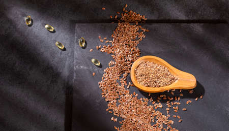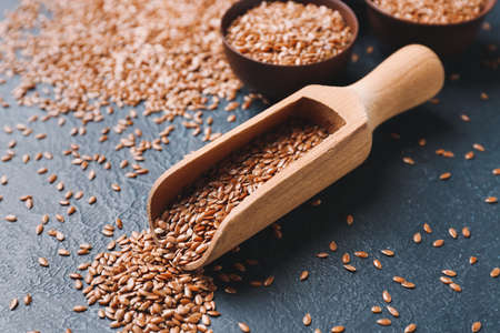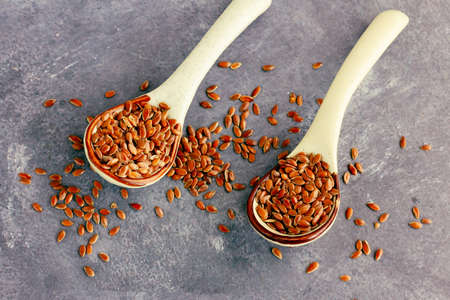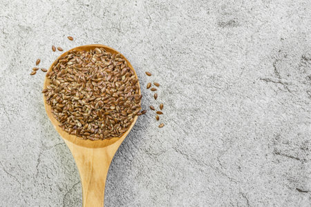 Food background, oil seed, flax seeds in a wooden spoon, food supplement for digestion, omega-3 source of vitamins and fatty acid antioxidants, herbal medicine remedy on natural gray concrete