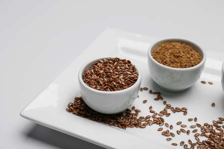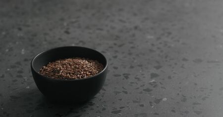 Organic food concept with flax seeds in a ceramic bowl on a table with copy space