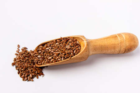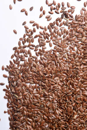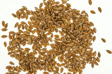 Brown flax seeds isolated on white background. Trendy superfood, ingredient for making healthy food
