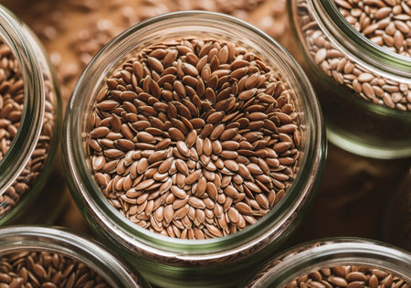 spice jar with flaxseeds close-up shot of pantry ingredients, concept of simple toppings to flavour your dishes