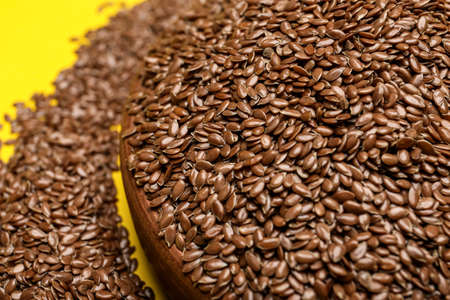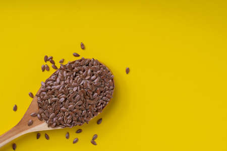 Flax seeds in a wooden spoon on a yellow background, copy space. Healthy eating