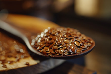 Close-Up of a Spoonful of Flax Seeds on Rustic Background. Concept of Healthy Eating, Nutrition, Organic Foods, and Natural Ingredients. Banner.