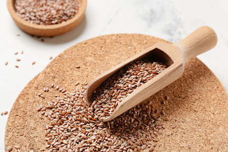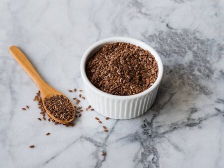 Linseed or flaxseed on wooden spoons and marble background, brown flax seeds, top view. Healthy eating. Organic product.