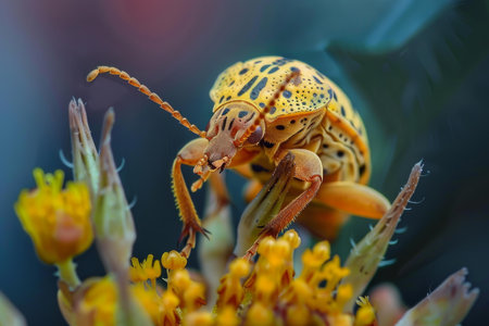 Macro shot of a yellow spotted beetle perched on delicate yellow blossoms