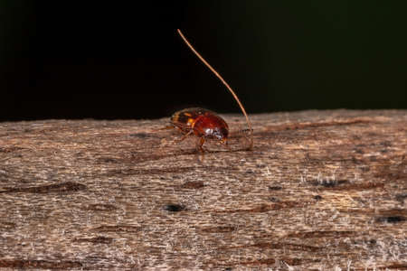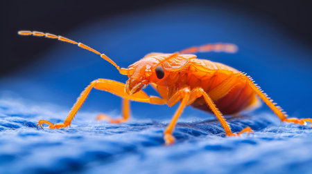 Macro shot of orange bedbug on blue pillowcase highlighting detailed long antennae