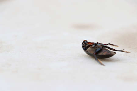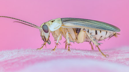 This macro close-up image showcases a cockroach with intricate details against a soft pink background, highlighting its unique features and textures.