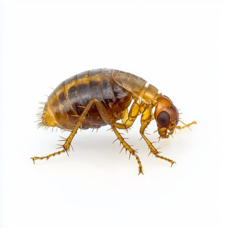 flea moves with its legs extended, revealing its small, rounded body and detailed features against a clean white backdrop, highlighting its unique anatomy.