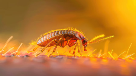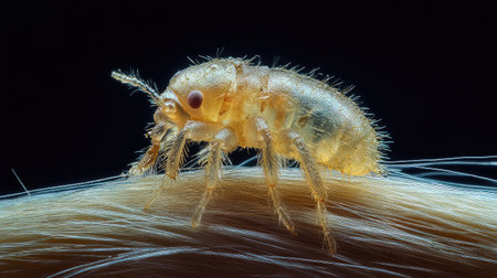 Flea on a pet's fur, highly magnified, showing detailed anatomy and fur texture