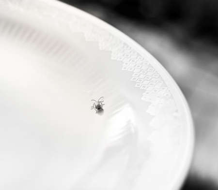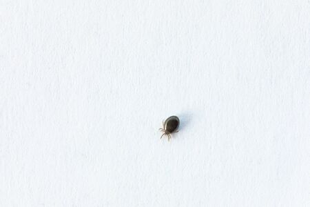 A true ixodid mite blood sucking parasite carrying the acarid disease sits on a On a white field on a hot summer day, hunting in anticipation of the victim