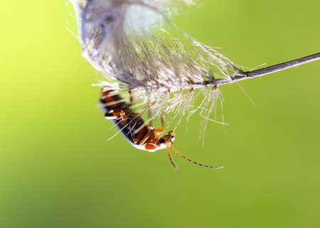 A beautiful beetle sits on a stalk against a background of green young grass, space for text