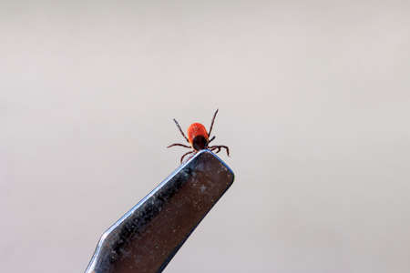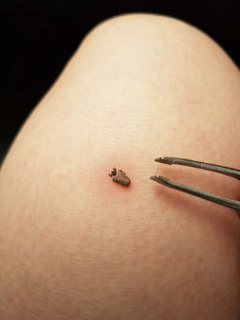 Holding engorged tick with tweezers. Lyme disease caused by borrelia.