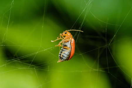 Aulacophora indica, commonly known as the pumpkin beetle, gets stuck in a spider web, highlighting natural pest control in action against this notorious crop pest