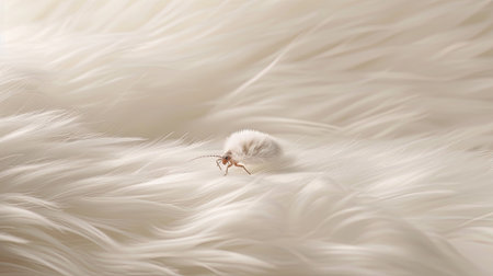 In a serene, dreamlike world of soft textures and pale lavender hues, a tiny weevil embarks on a gentle journey across a delicate feather. This macro perspective captures a moment of quiet discovery and the fragile beauty found in the smallest corners of nature, evoking a sense of peace and wonder.