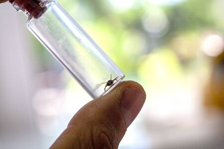 A man holds a test tube in his hands with a poisonous dangerous ixodid tick that bit him by infecting with lime disease. Examination of a tick in a laboratory for infectious diseases.