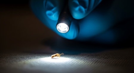 A gloved hand holds a flashlight, shining a beam of light on a termite on a textured surface.
