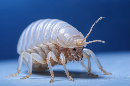 Dried Isopod White Woodlouse: A Close-up Exploration on a Blue Background with Focus Stacking and Copy Space