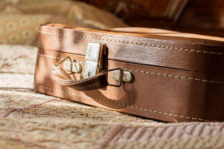 Old vintage suitcase in the room. The suitcase handle. Foreground, horizontal photo
