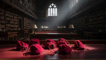 An expansive 16:9 cinematic wide shot capturing the moody atmosphere of a grand, historic library. T