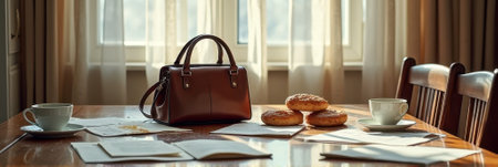 Elegant brown leather handbag on dining table with pastries and coffee cups near window. That the image is generated using AI.