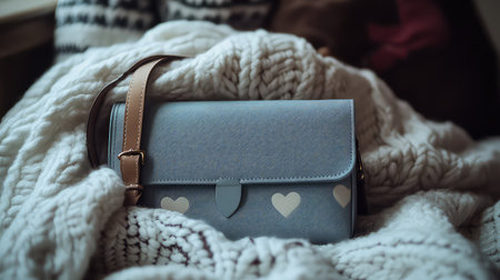 A soft blue handbag featuring a charming heart design, elegantly placed on a cozy knit blanket, perfect for illustrating lifestyle and comfort themes.