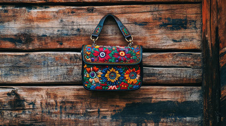This beautiful handcrafted bag features intricate floral embroidery and stands out against a rustic wooden background. Perfect for fashion lovers.