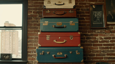 A vibrant collection of vintage suitcases stacked neatly against a rustic brick wall, capturing a blend of nostalgic charm and urban style within an apartment setting.